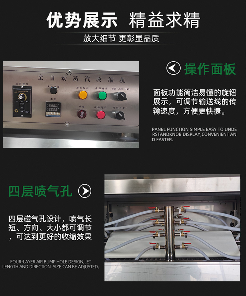 - 蒸汽能全方位接觸薄膜,使薄膜在收縮過程中各部位受熱均勻,形成的包裝外觀緊密、平整,能完美貼合在被包裝物品表面,有效防止灰塵、濕氣等進入包裝內(nèi)部。這對于包裝一些精密電子產(chǎn)品、高檔化妝品等對包裝外觀和保護性要求較高的產(chǎn)品尤為重要,能確保產(chǎn)品在時間,能確保產(chǎn)品在運輸和儲存過程中不受外界因素影響。