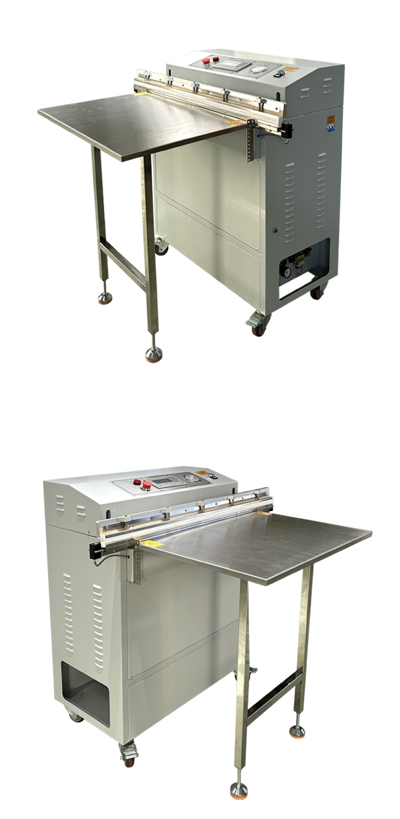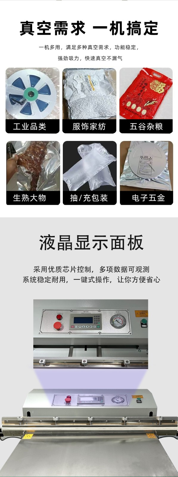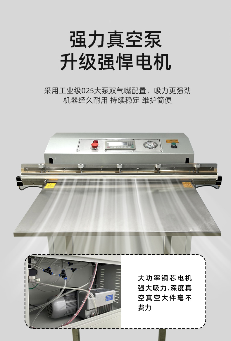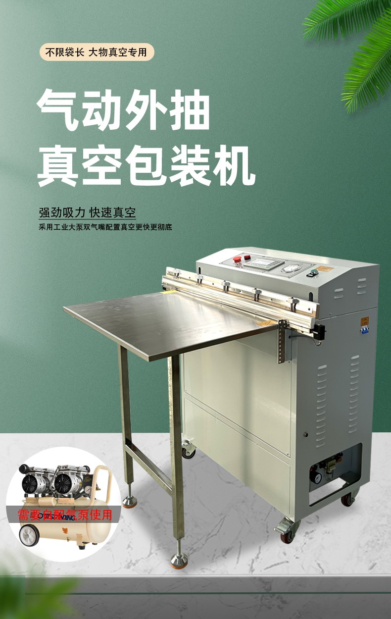 - 外抽式:包裝袋放置在真空室外部的工作臺上,通過抽氣系統(tǒng)從包裝袋外部抽氣,然后進行封口,實現(xiàn)真空包裝。