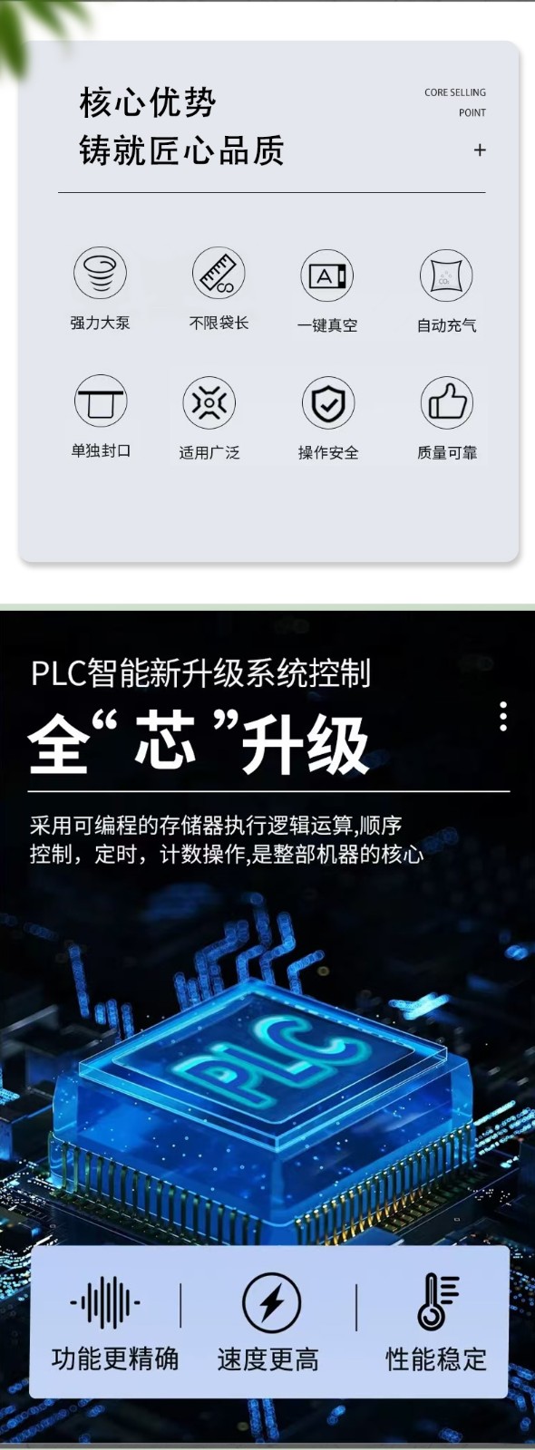 - 外抽式:因在包裝袋外部抽氣,包裝袋與工作臺間可能有縫隙,少量可能有縫隙,少量空氣會進入,真空度相對較低,但能滿足大多數(shù)普通產(chǎn)品的包裝要求