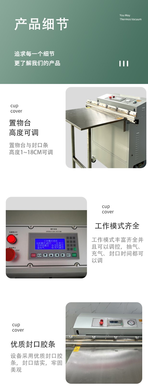 - 內(nèi)抽式:有密封的真空室,通常由不銹鋼制成,真空室大小決定了可包裝產(chǎn)品的尺寸范圍。配備真空泵、真空表、熱封裝置等,結(jié)構(gòu)相對復雜。