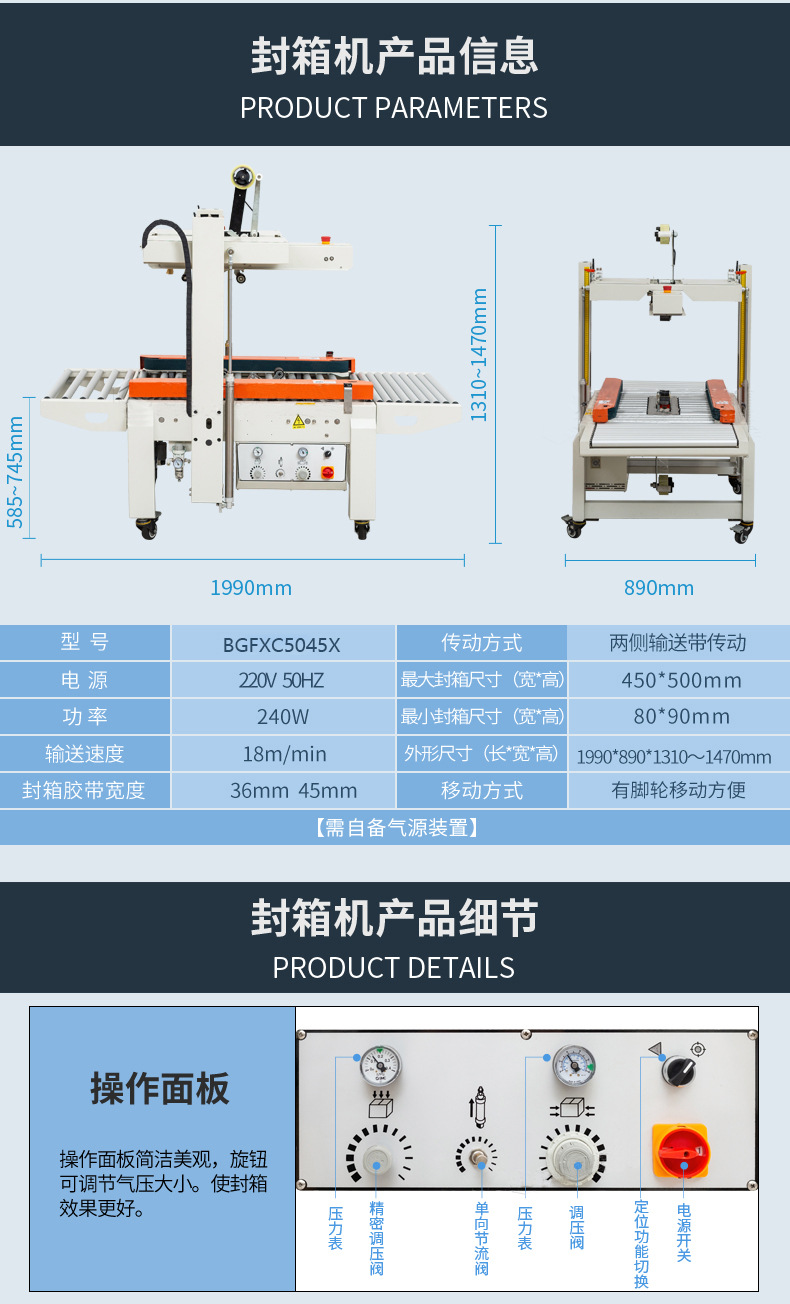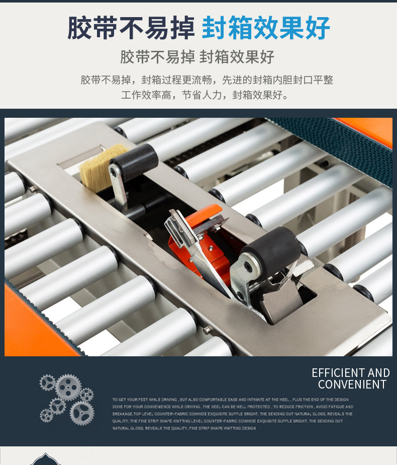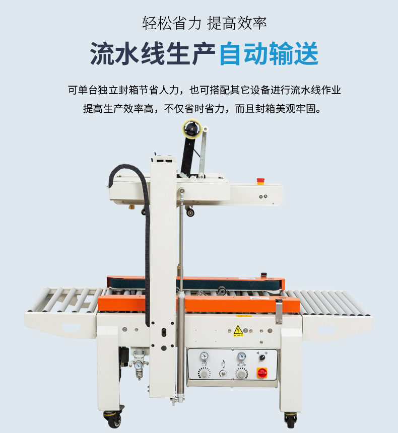 全自動封箱機的工作流程極為順暢高效。當紙箱被輸送至封箱機位置時,機器會自動感應并啟動。首先,通過精準的機械結構將紙箱的上蓋和側蓋快速折起,確保紙箱的形狀規(guī)整。接著,膠帶粘貼裝置迅速動作,將膠帶均勻、牢固地粘貼在紙箱的各個封口處。整個過程一氣呵成,無需人工干預,大大提高了包裝效率。