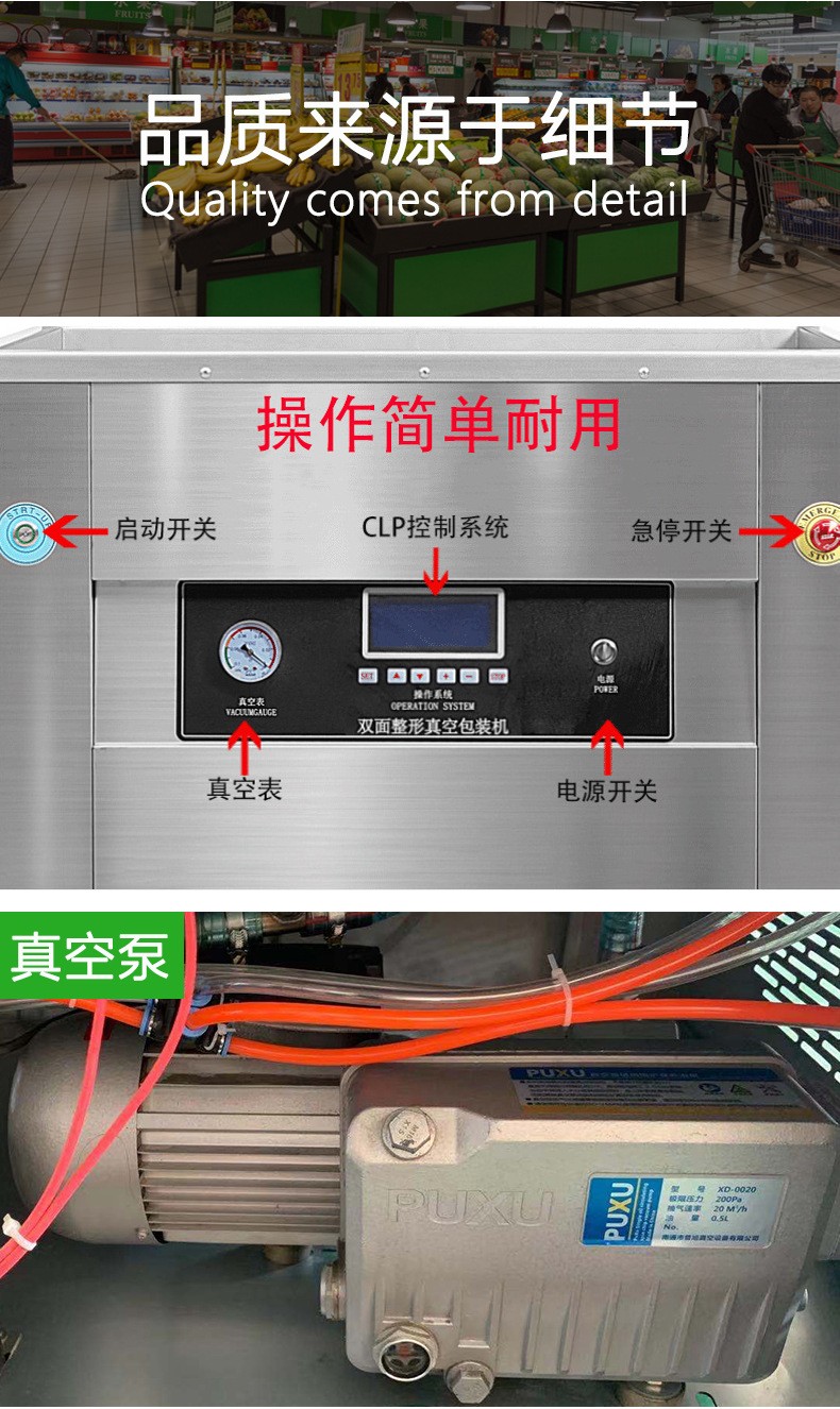 功能特點(diǎn) 整形功能 大米整形真空包裝機(jī)具備獨(dú)特的整形模塊。在包裝過程中,這個(gè)模塊可以對(duì)大米進(jìn)行整理,使大米在包裝袋內(nèi)排列更加整齊、緊密。通過物理擠壓或者特定的振動(dòng)方式,讓大米顆粒之間的間隙減小,呈現(xiàn)出規(guī)則的形狀,從而提升包裝的美觀度。 例如,對(duì)于一些高端大米品牌,經(jīng)過整形后的大米在包裝袋內(nèi)形狀規(guī)整,給消費(fèi)者一種高品質(zhì)的視覺感受,有助于提升產(chǎn)品的檔次。 真空包裝功能 真空系統(tǒng)是該包裝機(jī)的核心部分之一。它通過真空泵抽取包裝袋內(nèi)的空氣,使袋內(nèi)形成真空環(huán)境。通常情況下,能夠達(dá)到較高的真空度,一般在 -90kPa
