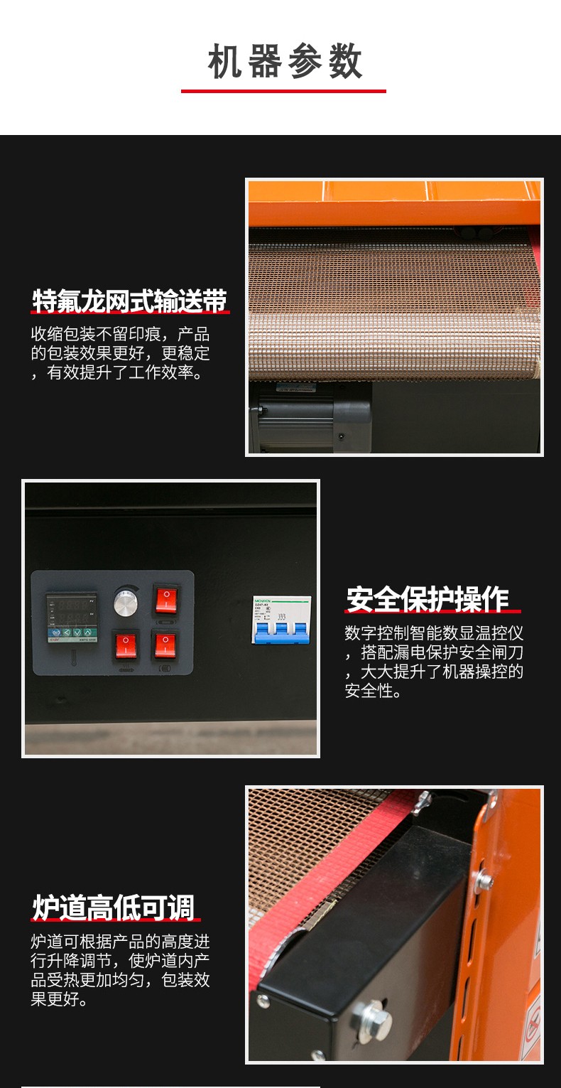 • 收縮溫度范圍:一般為 120 - 200℃。不同的熱收縮薄膜有不同的最佳收縮溫度,在選型時要考慮機(jī)器的溫度范圍是否能夠滿足所使用薄膜的要求。例如,PVC 薄膜的收縮溫度一般在 140 - 160℃,POF 薄膜的收縮溫度約為 160 - 180℃。