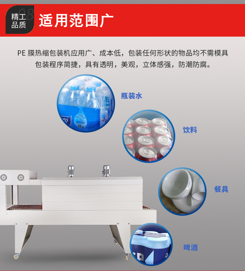 適用范圍廣:可以用于包裝各種形狀和尺寸的產(chǎn)品,無論是規(guī)則的圓柱體、長方體,還是不規(guī)則的產(chǎn)品,只要選擇合適的 PE 薄膜,都可以用這種機器進(jìn)行包裝。而且它可以與其他包裝設(shè)備和生產(chǎn)線集成,實現(xiàn)自動化包裝,提高生產(chǎn)效率。