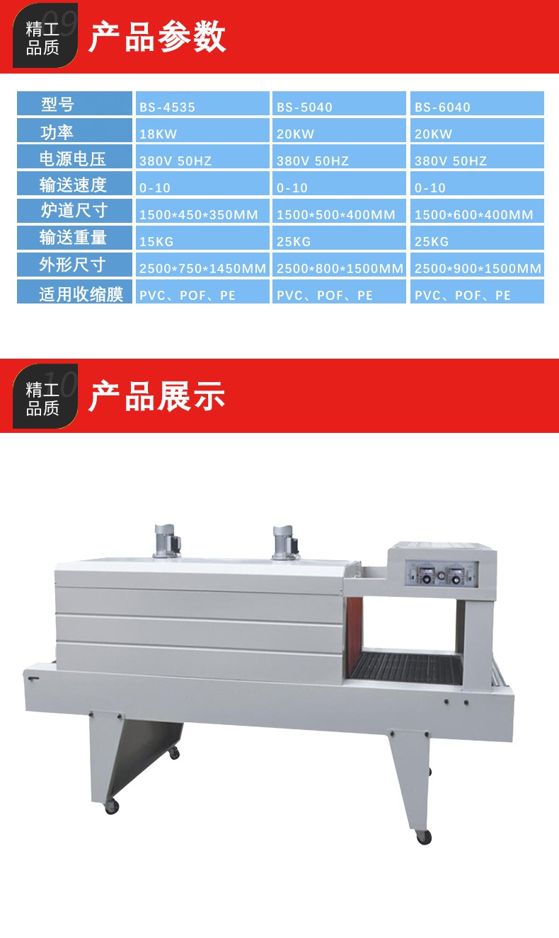 包裝質(zhì)量高:PE 熱收縮包裝機能夠使 PE 薄膜緊密地貼合產(chǎn)品,包裝后的產(chǎn)品外觀整潔、美觀,沒有褶皺。由于 PE 薄膜本身具有良好的柔韌性和透明度,包裝后的產(chǎn)品可以清晰地展示其形狀和外觀,同時也能有效地防止灰塵、水分等進(jìn)入產(chǎn)品,起到很好的保護(hù)作用。