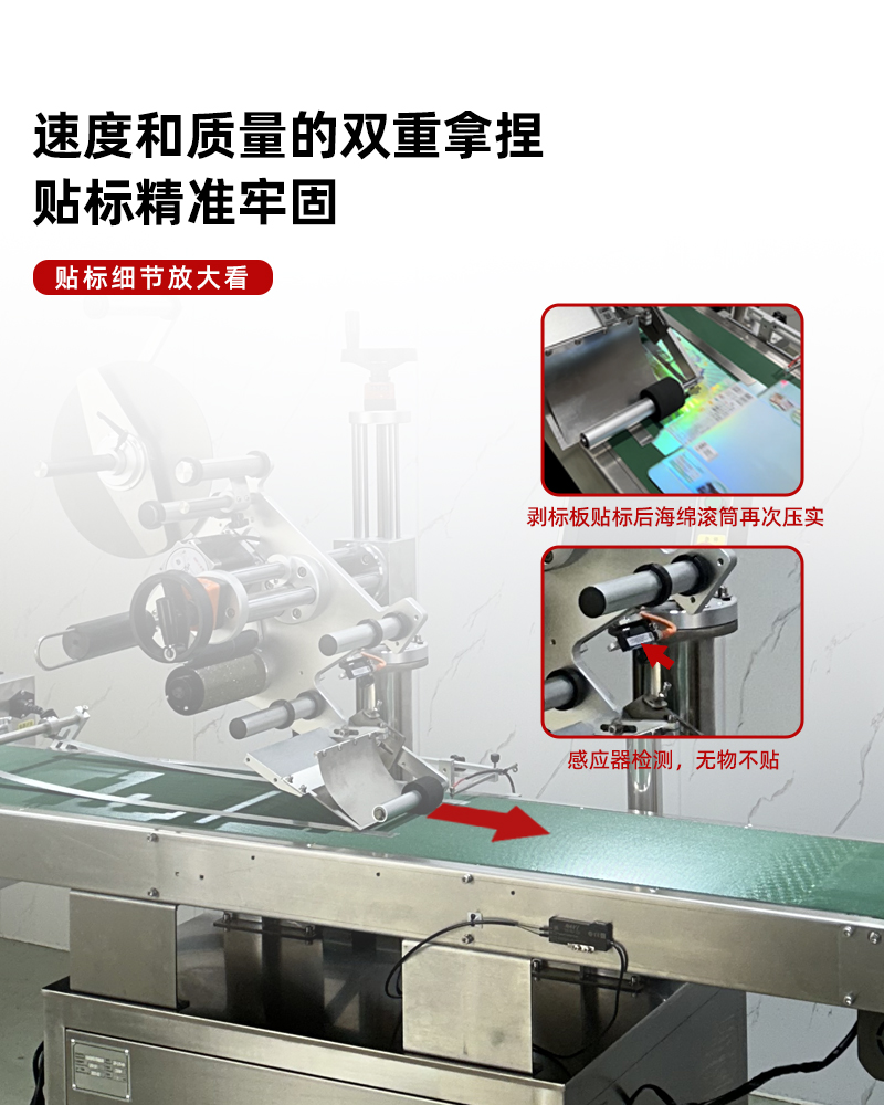 - 標簽輸送帶:負責(zé)將剝離后的標簽輸送至貼標位置,與產(chǎn)品輸送帶同步運行,確保標簽與產(chǎn)品在貼標瞬間準確對接。標簽輸送帶同樣具備精確的速度控制和位置校準功能。