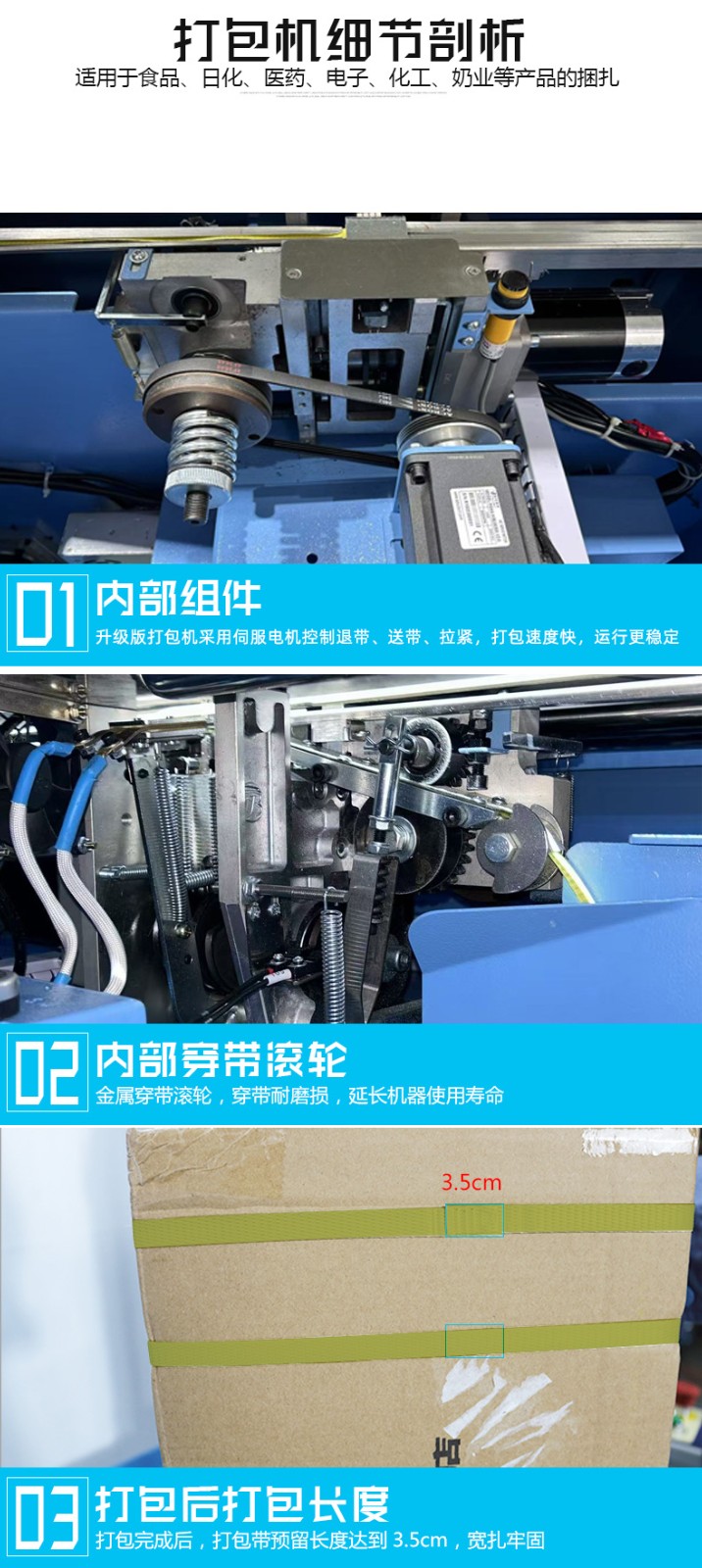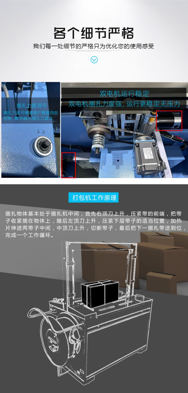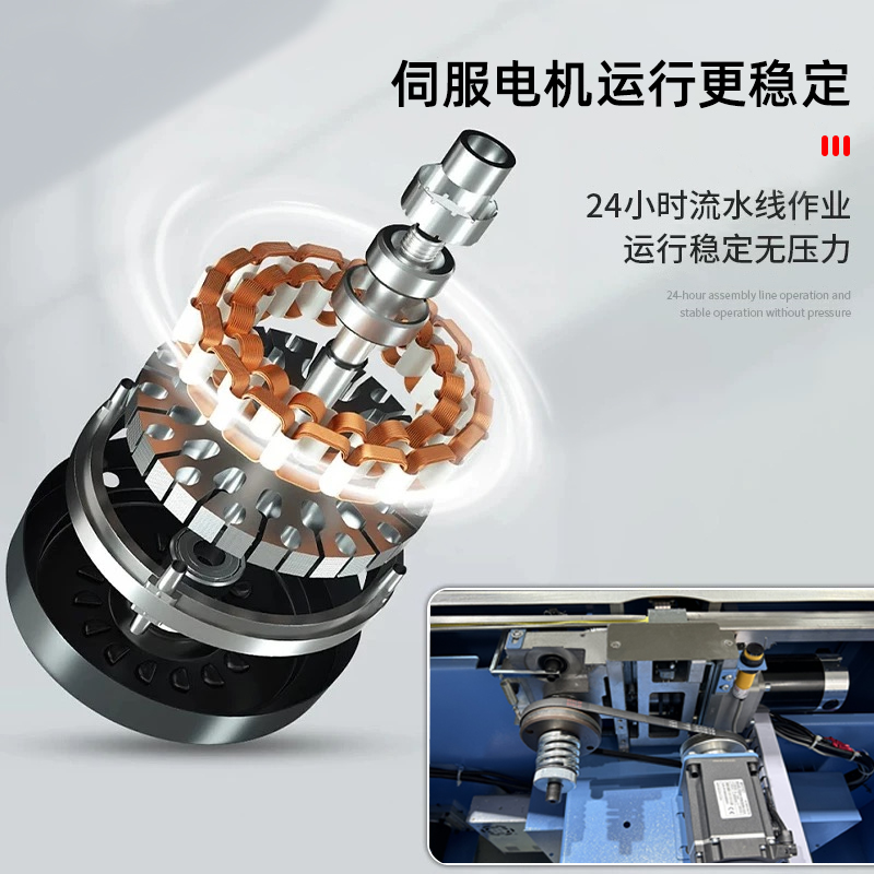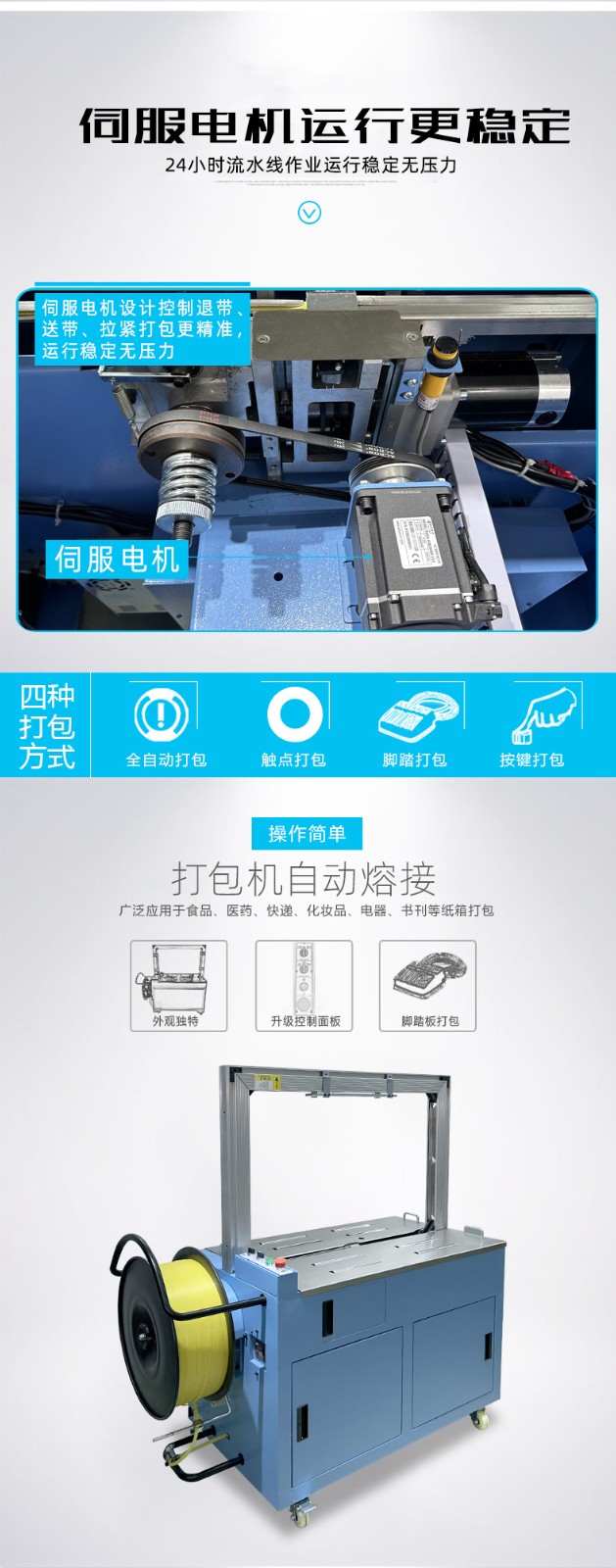 結構組成 伺服電機:作為核心部件,相比傳統(tǒng)電機,它能實現(xiàn)更高的控制精度和響應速度,可在捆扎時精準調整捆扎帶張力,保障捆扎的緊密與均勻。 控制系統(tǒng):負責智能化管理整個捆扎流程。通過傳感器與程序控制,實時監(jiān)測并調整捆扎速度、張力等參數(shù),用戶還能依不同產品需求設定相應捆扎參數(shù),滿足多樣化包裝需求。 捆扎裝置:一般采用熱合或熱熔方式固定捆扎帶。熱合是通過加熱使捆扎帶兩端熔合,形成牢固的捆扎效果,提高捆扎強度,防止運輸過程中松脫。 輸送系統(tǒng):負責將待捆扎產品送入捆扎機,常與輸送帶或自動化生產線等其他生產設備聯(lián)動,形