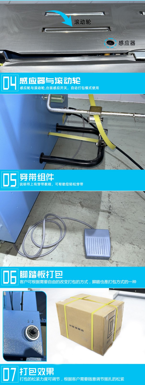 :待打包物品通過輸送帶被輸送到打包位置,在輸送過程中,機器會通過傳感器檢測物品的位置和尺寸信息,確保物品準確地停在打包區(qū)域內。
