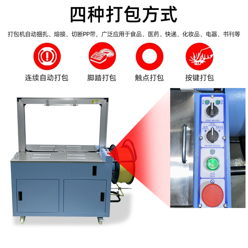 :機器啟動后,會自動從打包帶卷中抽出打包帶,并將其傳送到預定的位置,準備進行打包。這個過程無需人工干預,大大提高了工作效率。