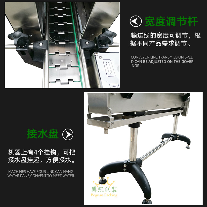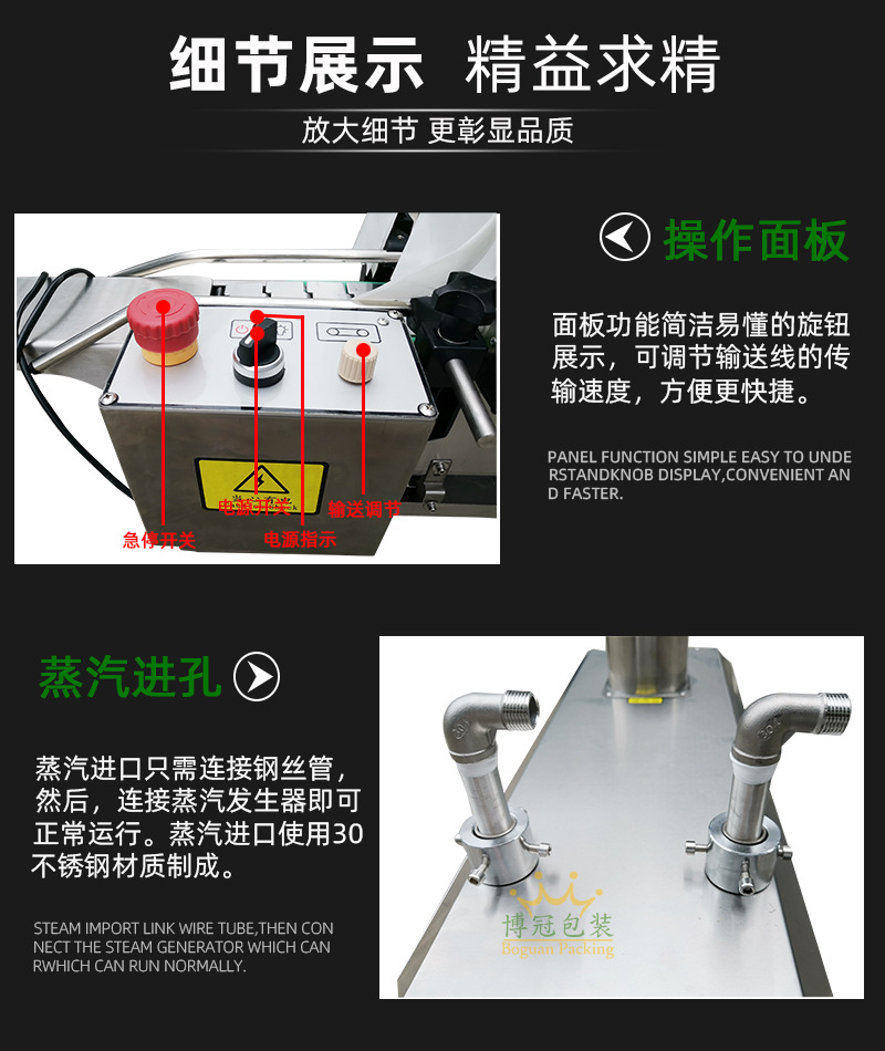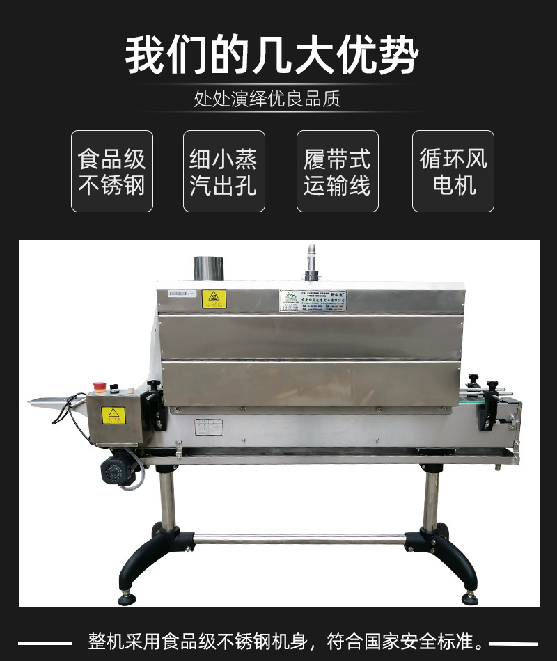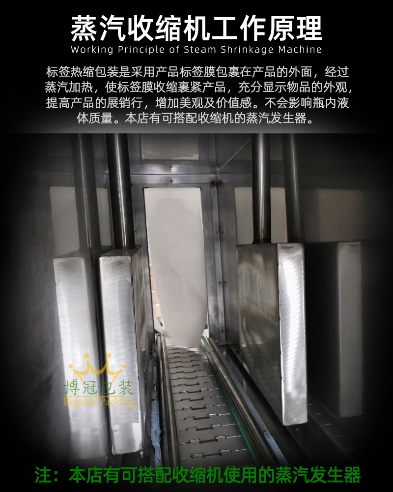 蒸汽式熱收縮機(jī)可以根據(jù)不同的生產(chǎn)速度來(lái)調(diào)節(jié)設(shè)備功率的大小,輸送帶采用無(wú)級(jí)調(diào)速,輸送速度可以任意調(diào)節(jié)。廣泛應(yīng)用于大桶或小瓶裝礦泉水、純凈水;汽水和茶飲料等食品飲料行業(yè),以及化妝品、洗發(fā)水和五金電子等需要收縮膜包裝的場(chǎng)合使用