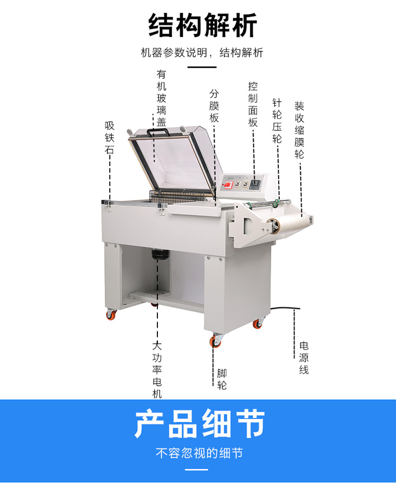PRODUCT CENTER收縮機(jī)除了可以用于包裝物品外,還可以用于其他領(lǐng)域,如醫(yī)療、化工、電子等。隨著科技的不斷進(jìn)步,熱收縮機(jī)也在不斷創(chuàng)新和發(fā)展,未來的熱收縮機(jī)將會(huì)更加智能化、高效化,為我們的生活帶來更多的便利和福利。