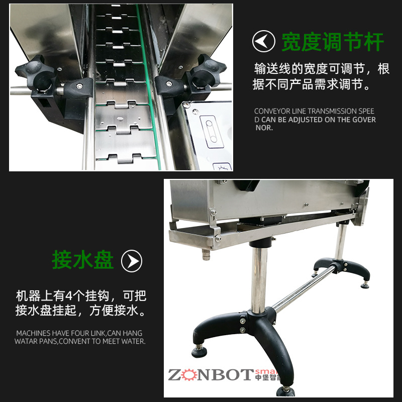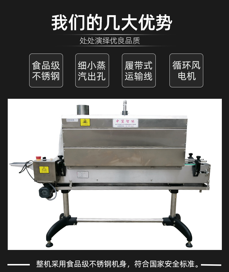 PRODUCT CENTER利用蒸汽獨(dú)有的恒溫而且溫度擴(kuò)散均勻的特性來(lái)工作,以達(dá)到普通電熱紅外加熱收縮機(jī)不可比擬的效果。設(shè)備采用加熱器加熱水而產(chǎn)生蒸汽,不需要另外配備蒸汽鍋爐。主機(jī)有主副2個(gè)加熱器,可以根據(jù)不同的生產(chǎn)速度來(lái)調(diào)節(jié)設(shè)備功率的大小,輸送帶采用無(wú)級(jí)調(diào)速,輸送速度可以任意調(diào)節(jié)。廣泛應(yīng)用于大桶或小瓶裝礦泉水、純凈水;汽水和茶飲料等食品飲料行業(yè),以及化妝品、洗發(fā)水和五金電子等需要收縮膜包裝的場(chǎng)合使用。
